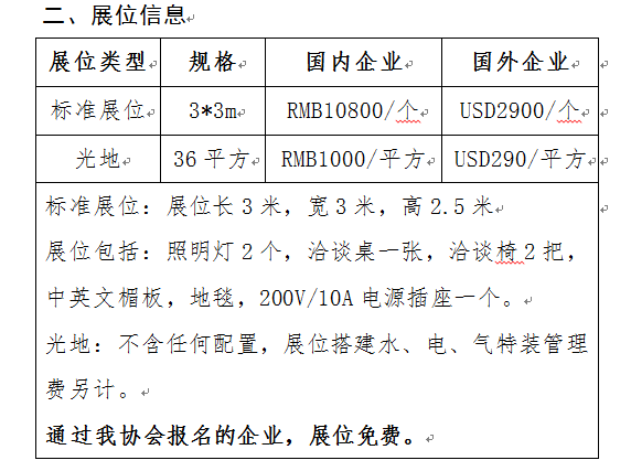 本次参展展位免费(含标准展位、光地),展位搭建布置及材料运输等由参展单位自行负责。名额有限,报完即止!