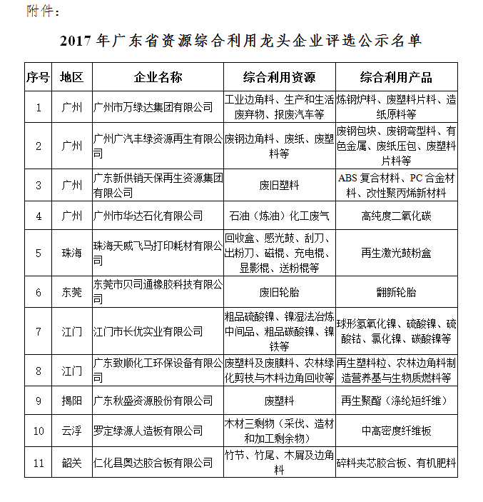 关于公布2017年广东省资源综合利用龙头企业名单的通知