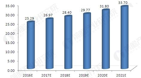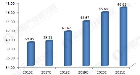 2016-2021年中国工业固体废物产生量情况预测(单位:亿吨)