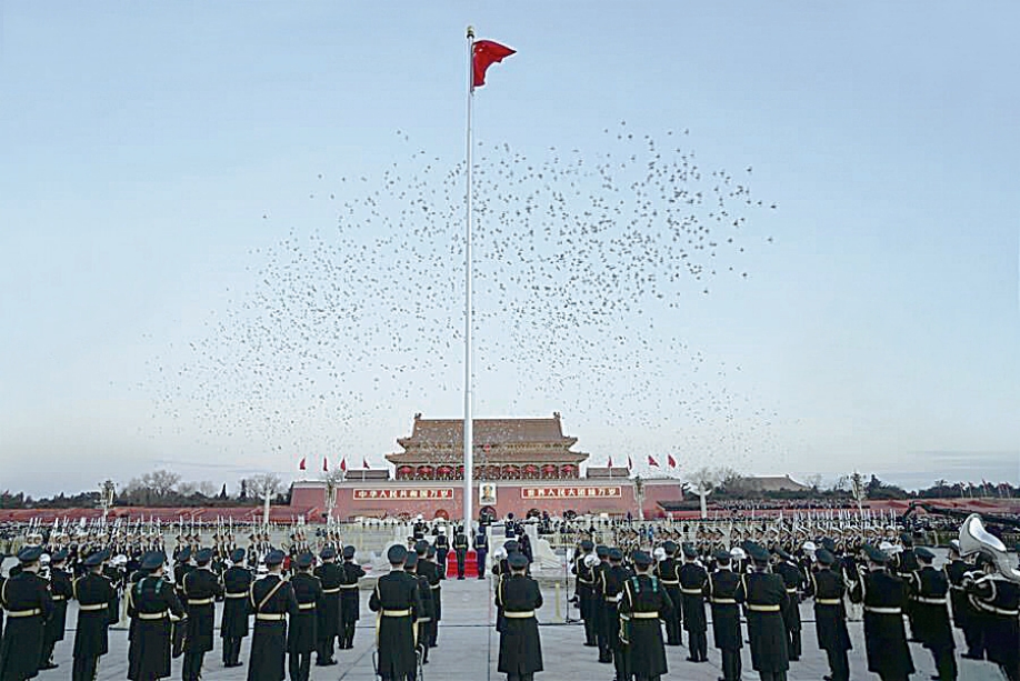 新时代、新仪式、新气象。经党中央批准,自 2018年1月1日起由中国人民解放军担负国旗护卫和礼炮鸣放任务后,解放军仪仗队和军乐团迎着新年第一缕晨曦,首次在北京天安门广场执行奏国歌、升国旗仪式。