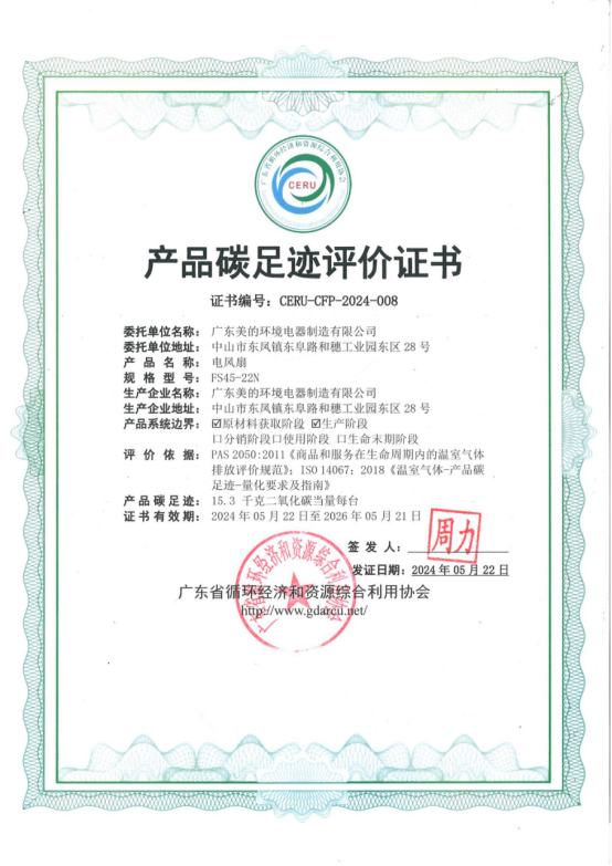 广东美的环境电器制造有限公司电风扇产品碳足迹评价证书