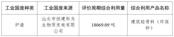 根据《工业固体废物资源综合利用评价管理暂行办法》(中华人民共和国工业和信息化部公告[2018]26号)要求,受汕头市绿丰源环保科技有限公司委托,我协会对该公司开展工业固体废物资源综合利用评价。经评价小组现场勘查核定,该公司2025年1月-9月对汕头市恒建科为生物质发电有限公司的炉渣进行综合利用,经处理后成为资源综合利用产品建筑轻骨料(环保砂)。现将该公司工业固体废物资源综合利用评价情况公示如下: