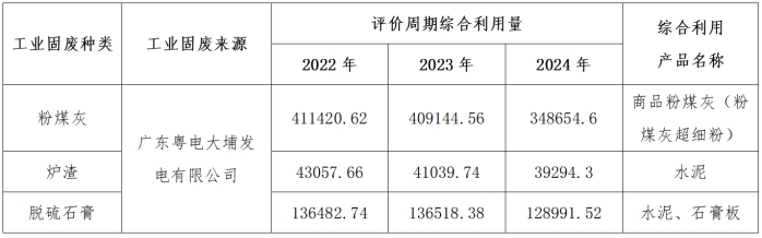 根据《工业固体废物资源综合利用评价管理暂行办法》(中华人民共和国工业和信息化部公告[2018]26号)要求,受广东粤电大埔发电有限公司委托,我协会对该公司开展工业固体废物资源综合利用评价,经评价小组核定,该公司2022、2023、2024年自产工业固体废物粉煤灰分别为411420.62吨、409144.56吨、348654.6吨,经处理后成为资源综合利用产品商品粉煤灰(粉煤灰超细粉)。此外,公司2022、2023、2024年产生的炉渣、脱硫石膏作为水泥和石膏板的原材料外售其他综合利用企业进行加工利用,炉渣综合利用量分别为43057.66吨、41039.74吨、39294.3吨,脱硫石膏综合利用量分别为136482.74吨、136518.38吨、128991.52吨, 实现“点对点”定向利用。现将该公司工业固体废物资源综合利用评价情况公示如下: